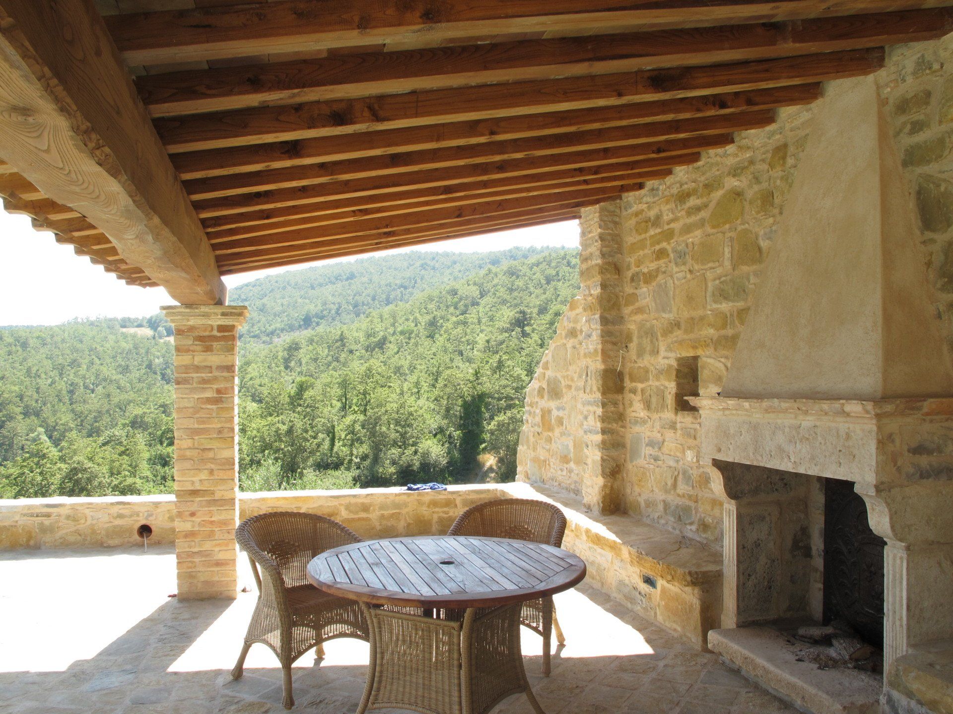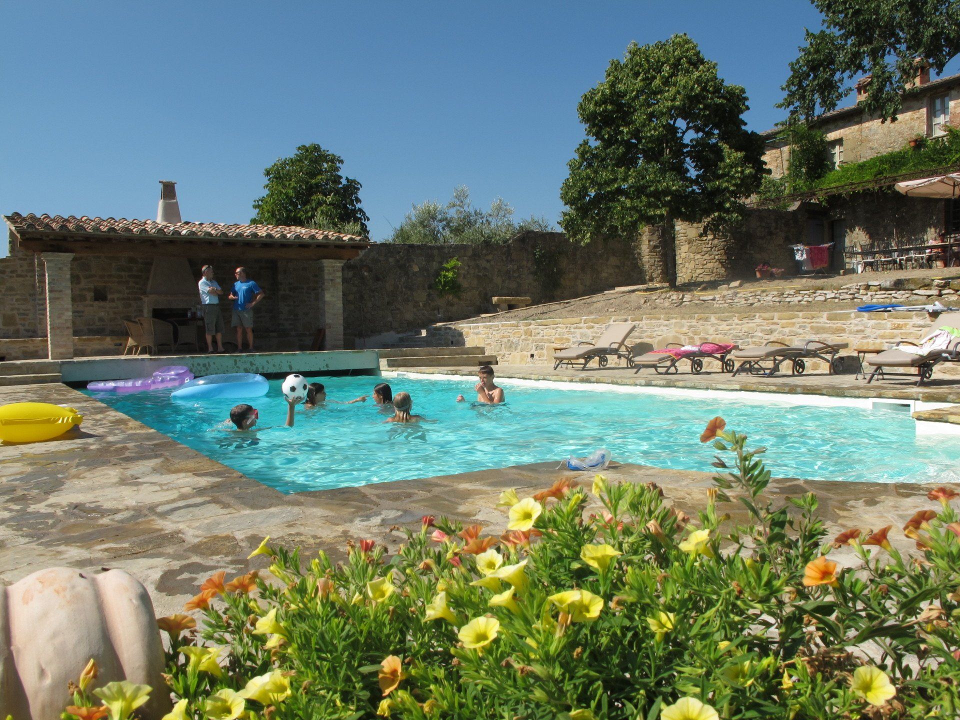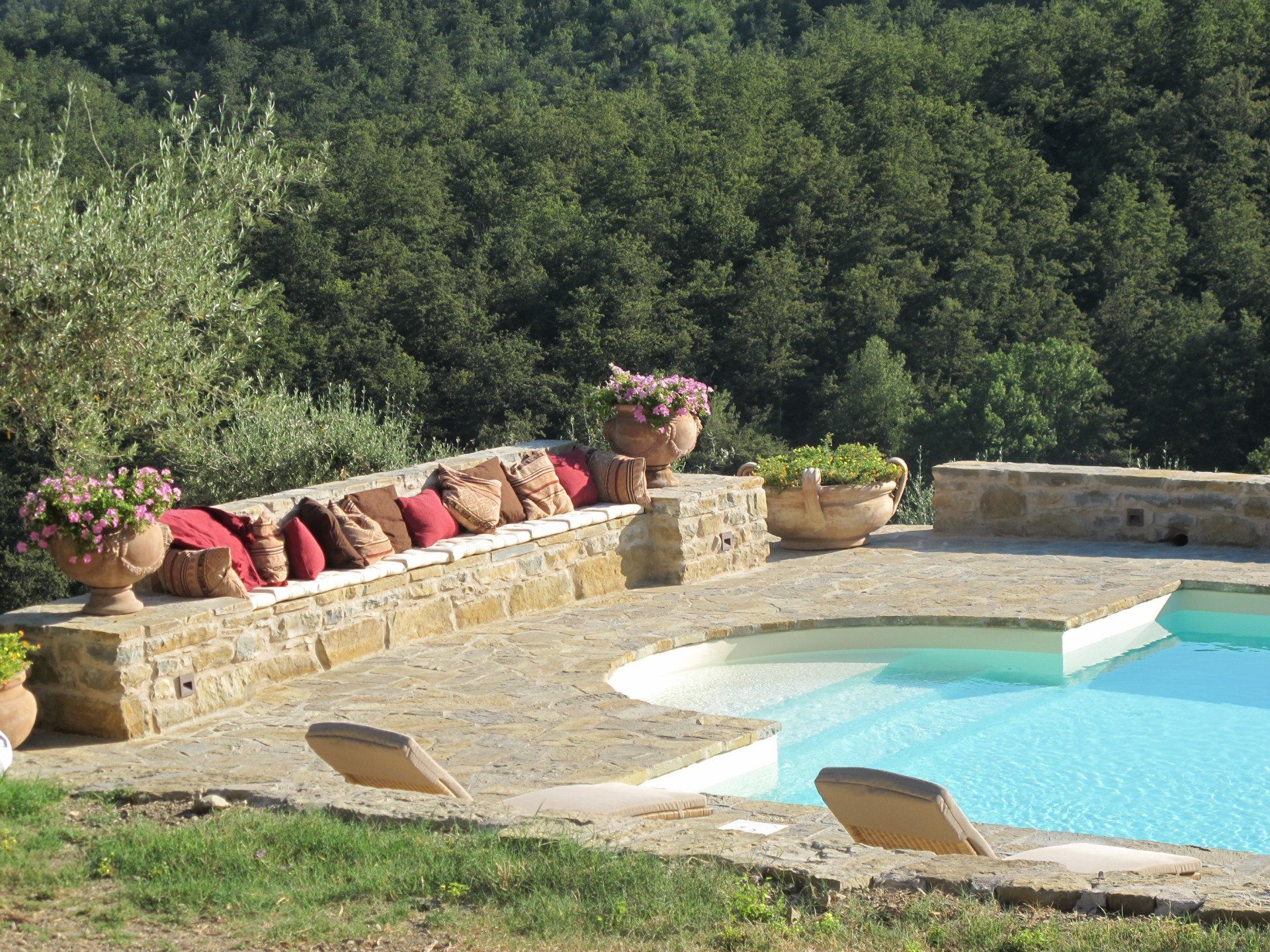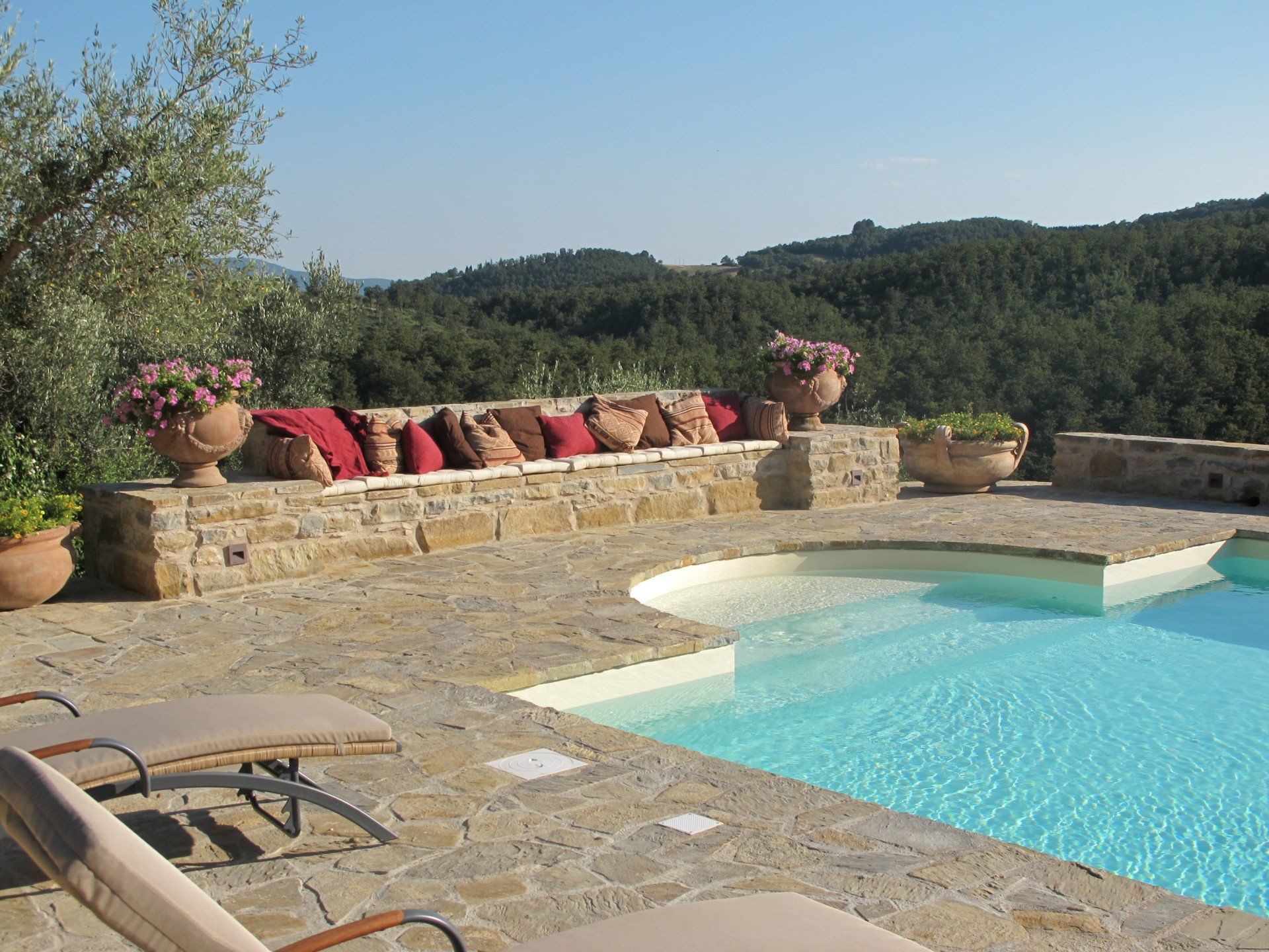 This standard 6x12 pool has roman steps on one side and an electric cover on the opposite side, where a loggia with open fireplace provides shade and a convivial space. It has sand color liner which is in tune with the surrounding stone used for the solarium. The views all around, as usual in Umbria, are gorgeous.