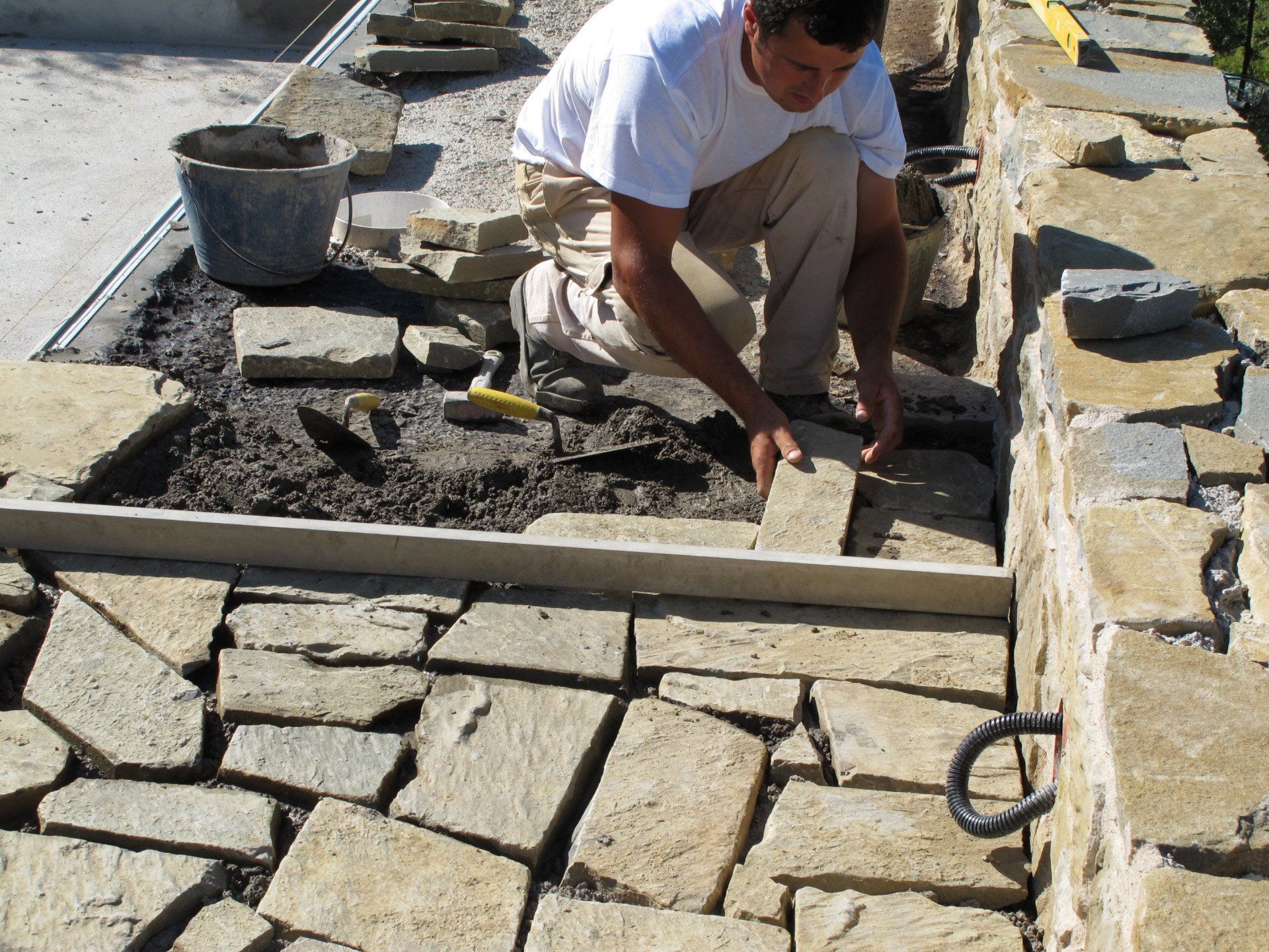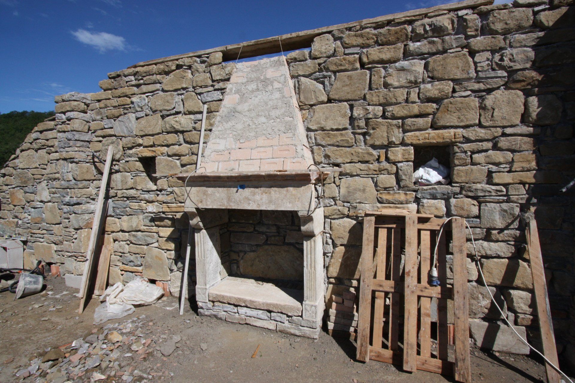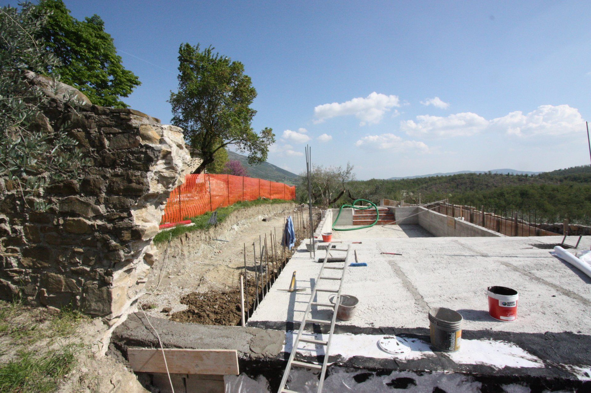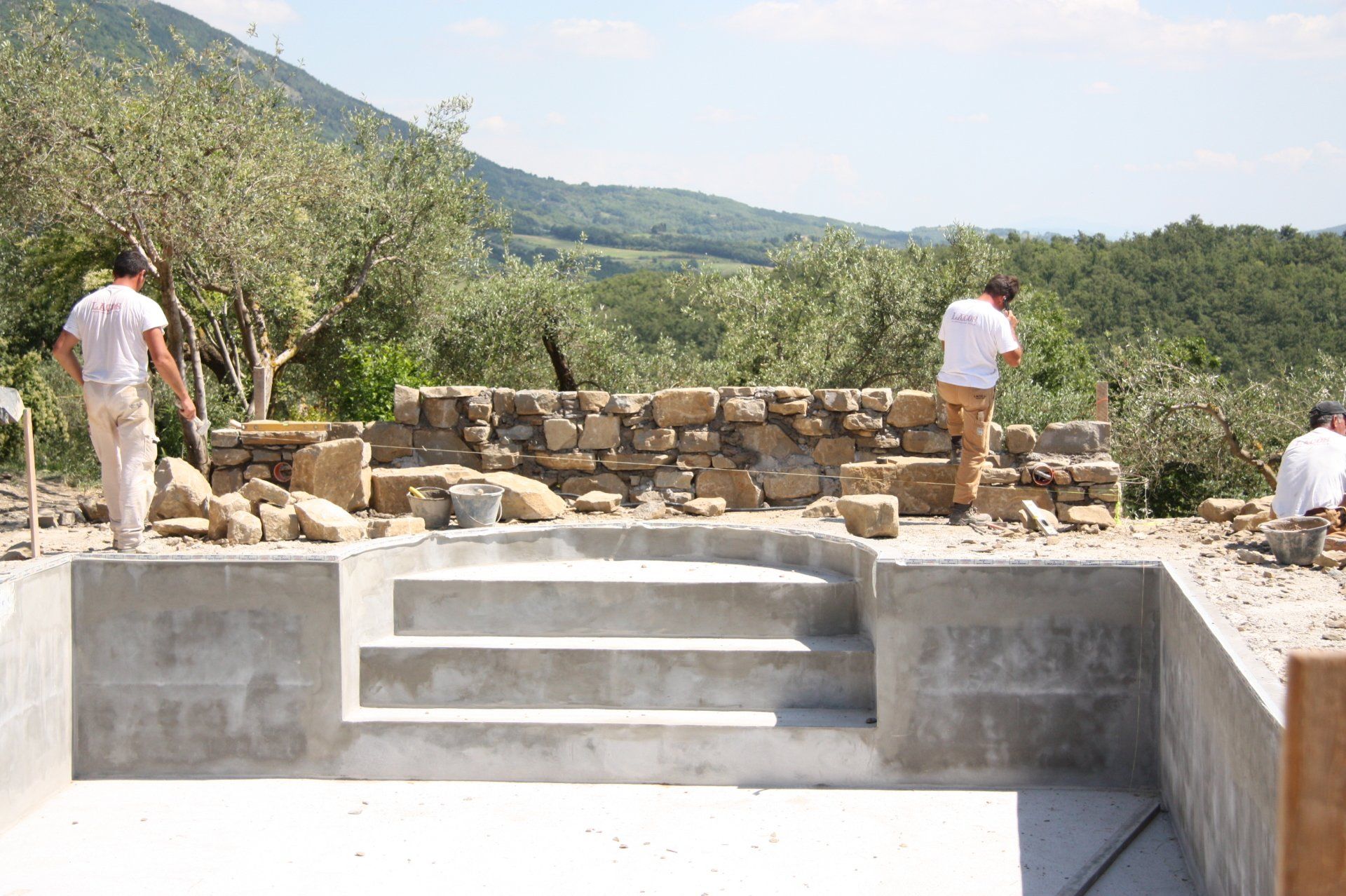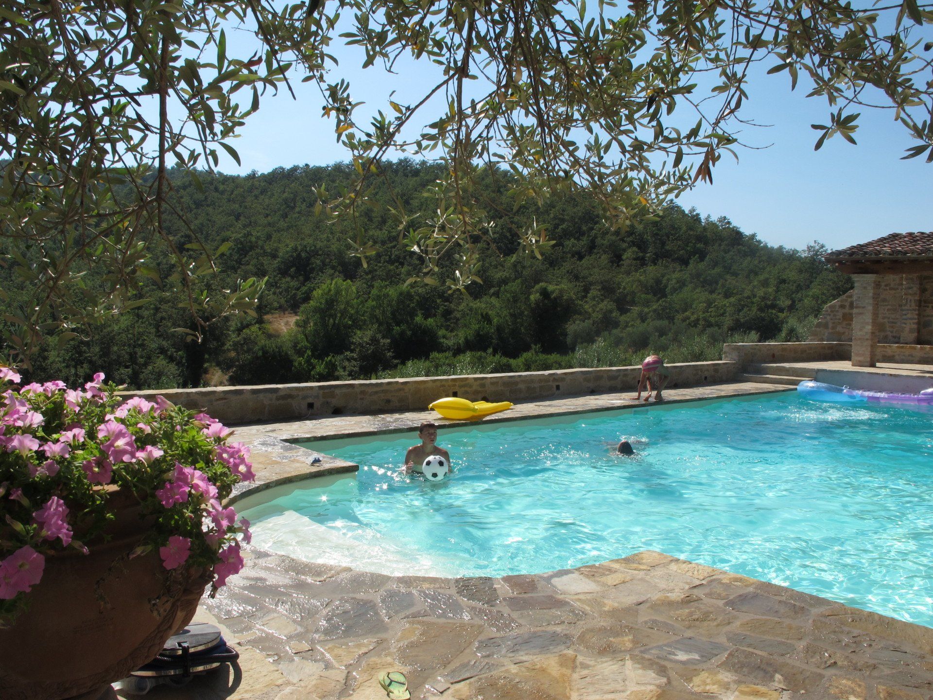This standard 6x12 pool has roman steps on one side and an electric cover on the opposite side, where a loggia with open fireplace provides shade and a convivial space. It has sand color liner which is in tune with the surrounding stone used for the solarium. The views all around, as usual in Umbria, are gorgeous.
