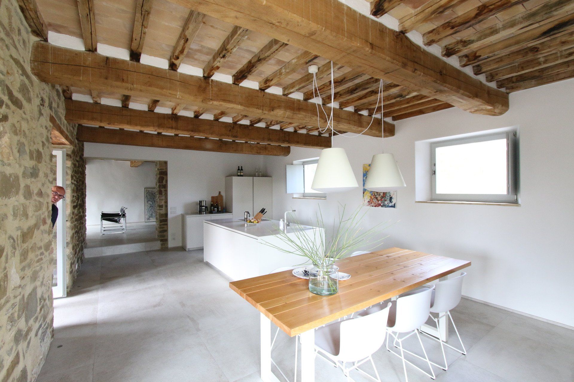 One of the recurrent issues when restoring an old farmhouse is where to locate the internal stairs and what material to use. These houses had in fact the two floors completely separate, the ground as stables for animals and the upper floor for the people, with no internal connection but only an external – usually beautiful – staircase. So, when renovating the ground floor we need to insert new stairs. In order to save space and achieve lightness, I like to insert slender metal stairs, often in cor-ten (rusty metal) a material that integrate itself beautifully with the old, existing materials, such as stone, brick, timber of traditional umbrian farmhouses. A renovation in Umbria by architect Marco Carlini