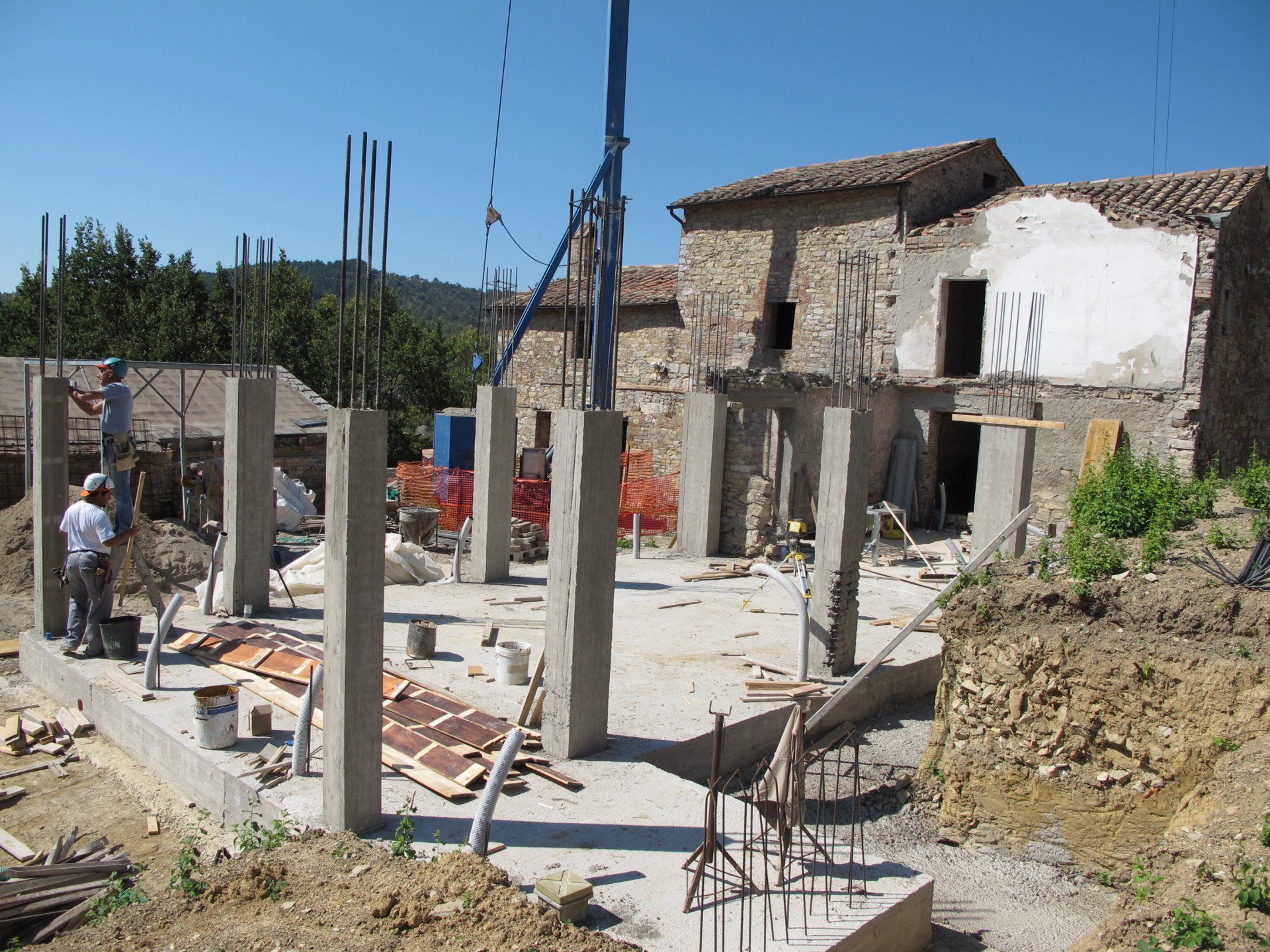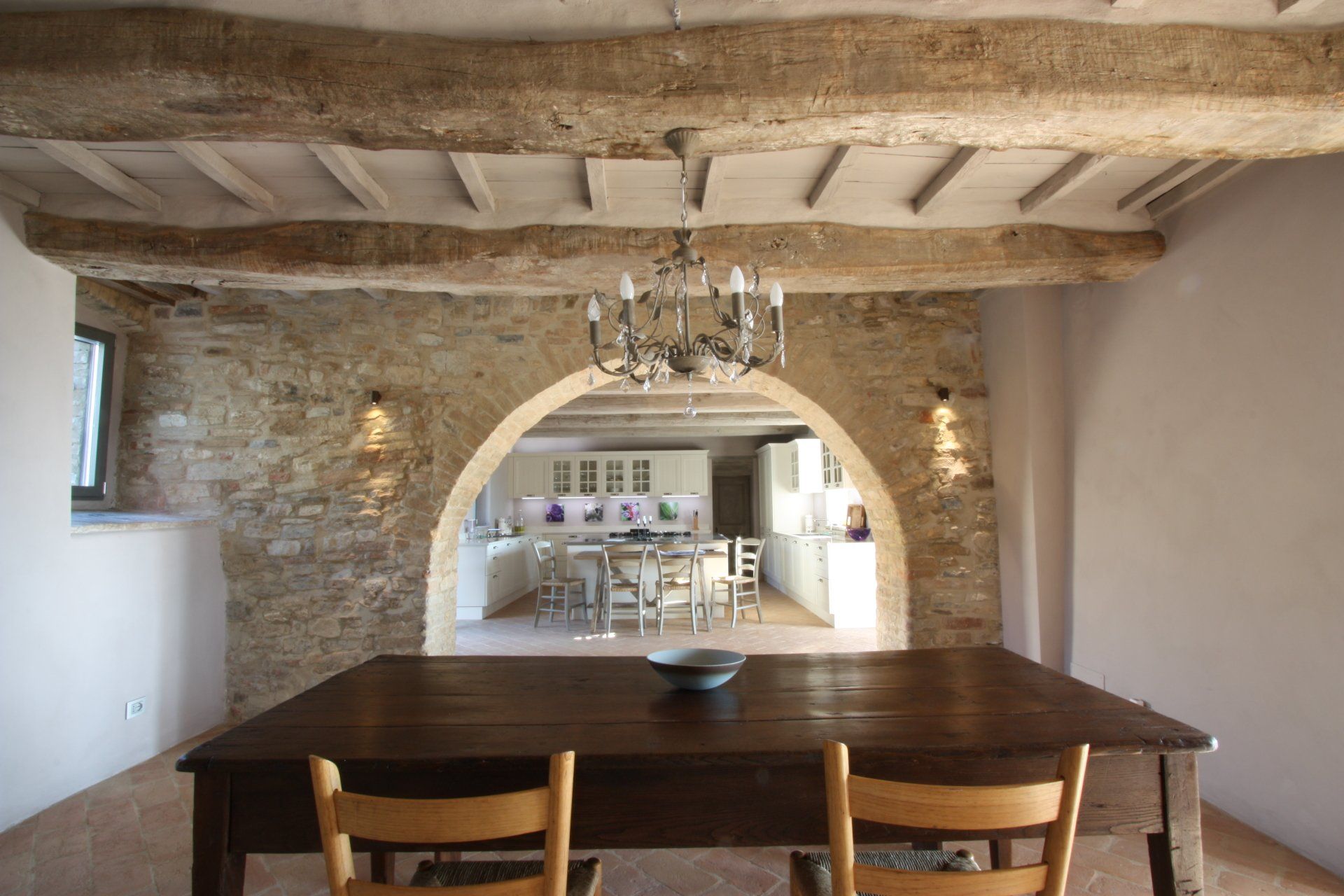 Restoration means respect for the original architectural elements but also involves structural consolidation (Umbria is a seismic region) and often extensions, in order to provide modern living comforts to these beautiful stone houses. Where farmers are constantly abandoning the rural areas and its buildings, new residents contribute to keep the countryside alive. This large house, restored in 2011, looked more like a borgo rather than just a farmhouse and it was extended with the creation of a new loggia to echo the existing one on the other side. Traditional materials and techniques have been used for the reconstruction of roof and floors (chestnut beams and rafters with terracotta pianelle and wooden planks). To maximize the light we used metal windows which have a thinner frame compared to wood or aluminium.